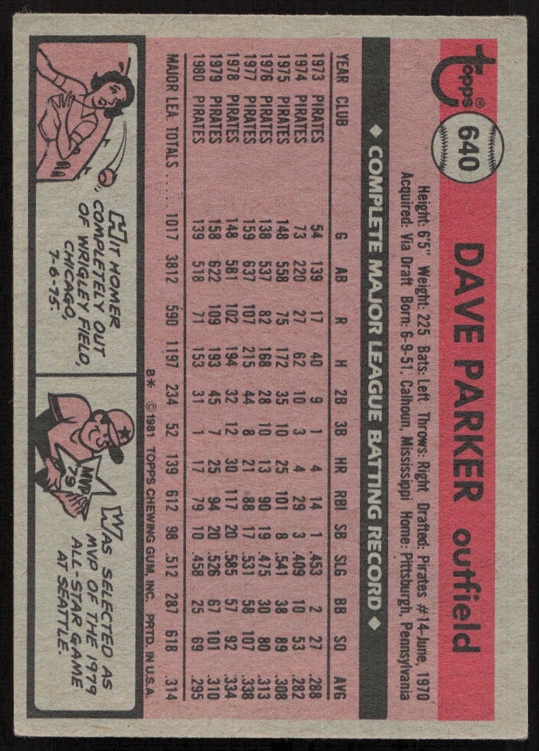 This Baseball card, from 1981 is part of the Topps card set. Dave Parker is featured and has a card number of 640.
