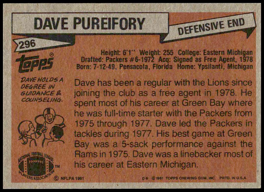 This Football card, from 1981 is part of the Topps  card set. Dave Pureifory is featured and has a card number of 296.