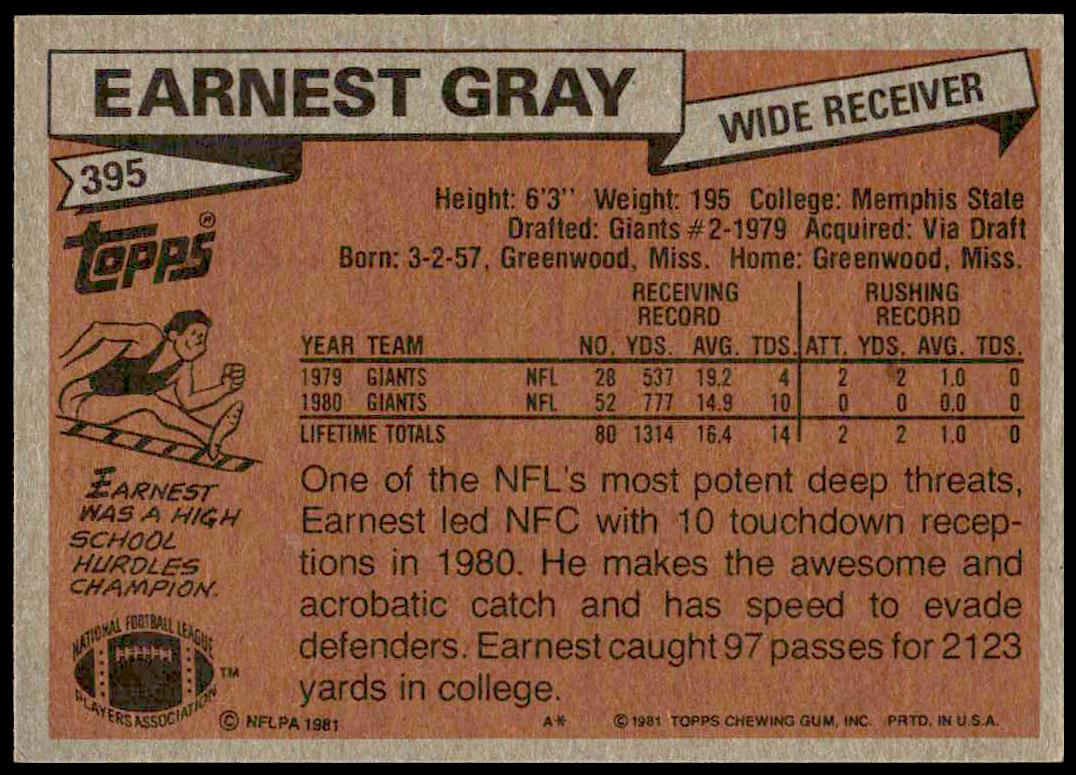 This Football card, from 1981 is part of the Topps  card set. Earnest Gray is featured and has a card number of 395.