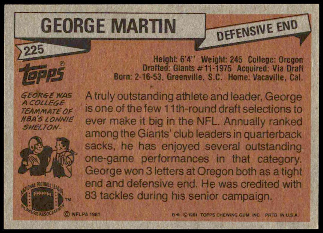 This Football card, from 1981 is part of the Topps  card set. George Martin is featured and has a card number of 225.