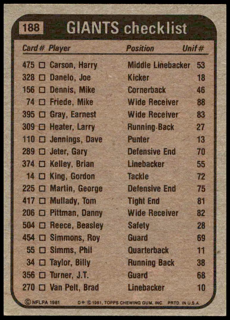 This Football card, from 1981 is part of the Topps  card set. Giants Checklist is featured and has a card number of 188.