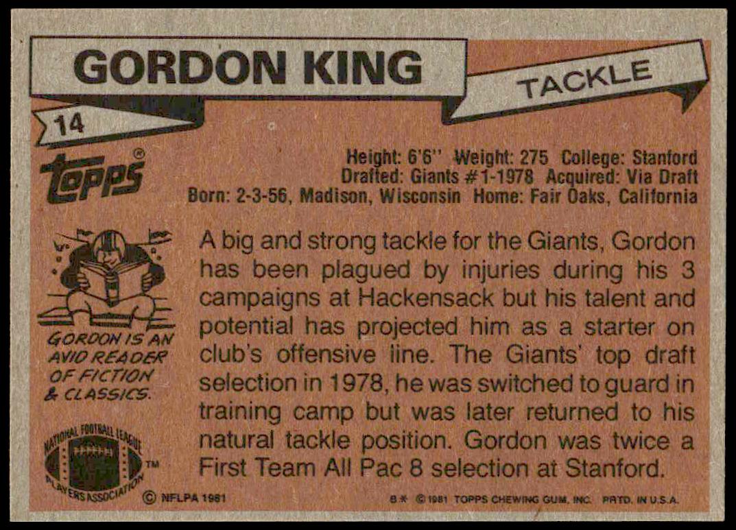 This Football card, from 1981 is part of the Topps  card set. Gordon King is featured and has a card number of 14.