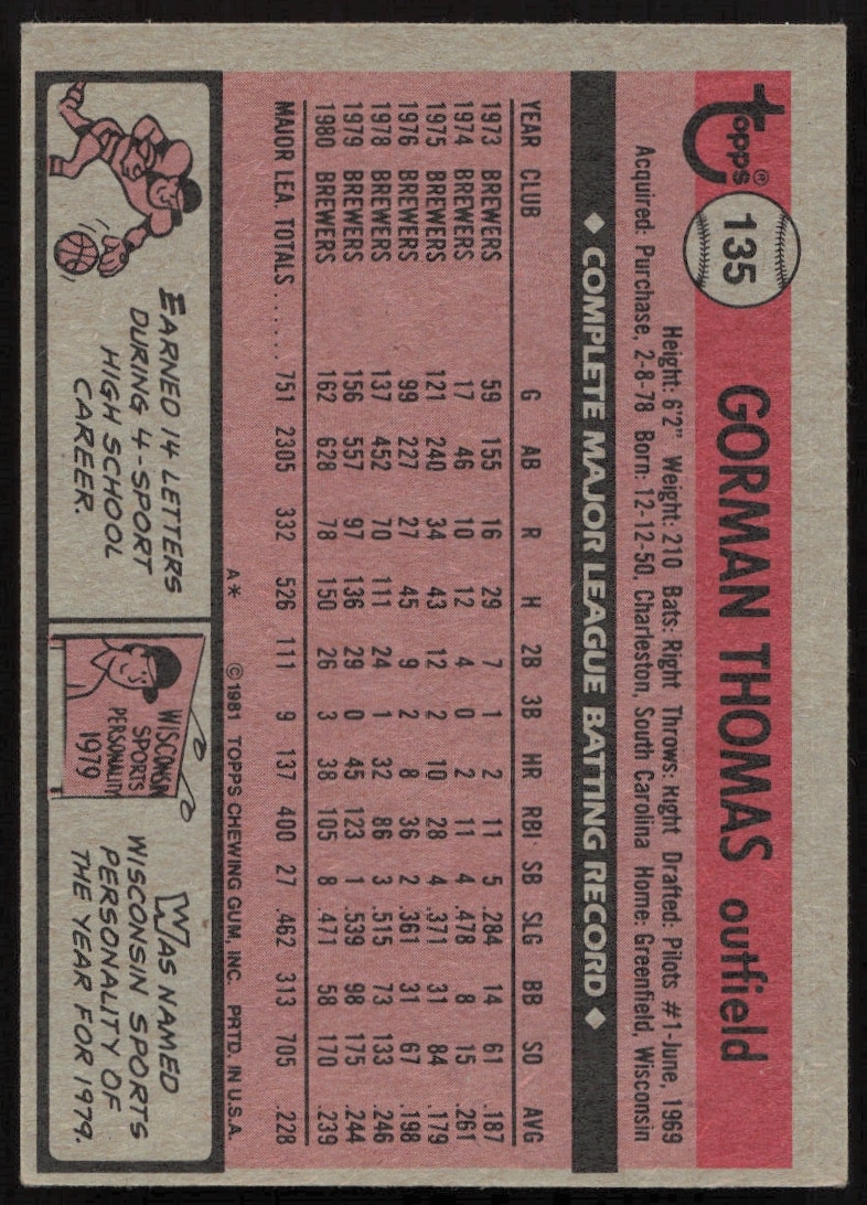 This Baseball card, from 1981 is part of the Topps card set. Gorman Thomas is featured and has a card number of 135.