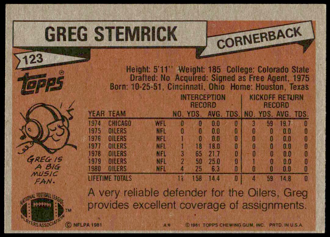 This Football card, from 1981 is part of the Topps  card set. Greg Stemrick is featured and has a card number of 123.