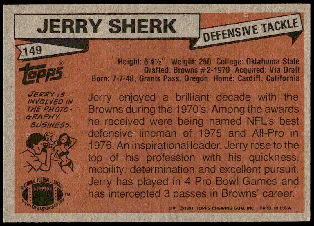 This Football card, from 1981 is part of the Topps  card set. Jerry Sherk is featured and has a card number of 149.