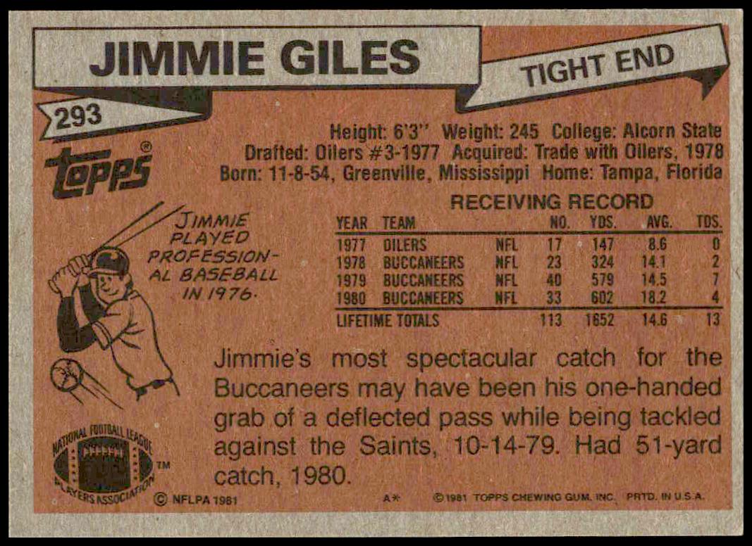 This Football card, from 1981 is part of the Topps  card set. Jimmie Giles is featured and has a card number of 293.