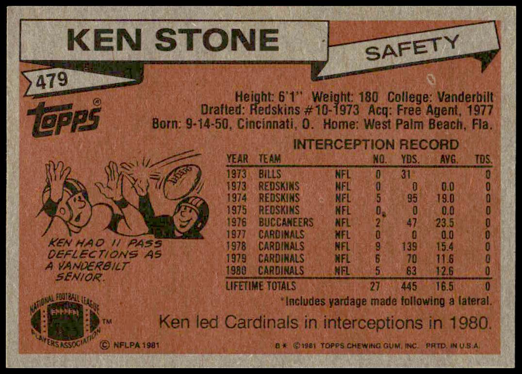 This Football card, from 1981 is part of the Topps  card set. Ken Stone is featured and has a card number of 479.