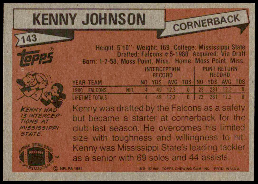 This Football card, from 1981 is part of the Topps  card set. Kenny Johnson is featured and has a card number of 143.