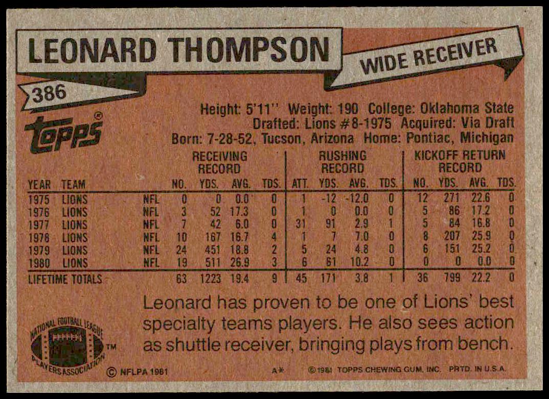 This Football card, from 1981 is part of the Topps  card set. Leonard Thompson is featured and has a card number of 386.