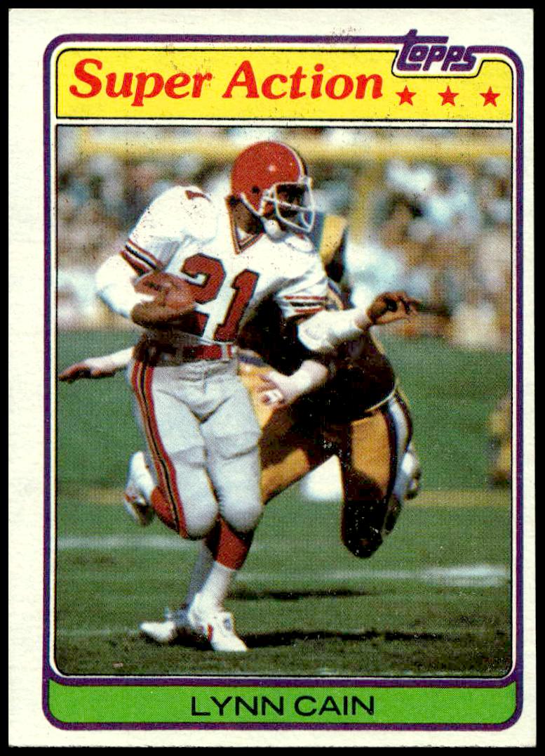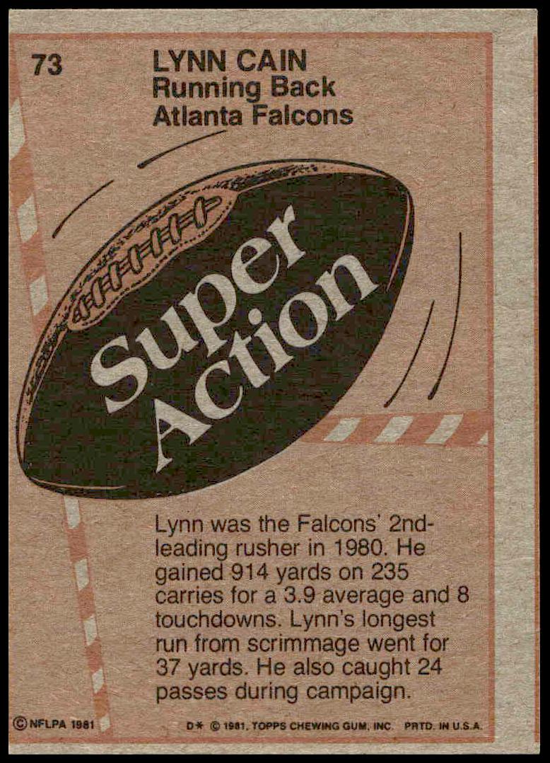 This Football card, from 1981 is part of the Topps  card set. Lynn Cain is featured and has a card number of 73.