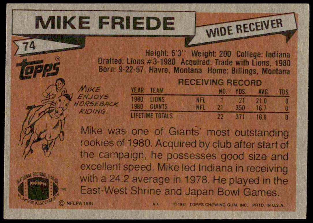 This Football card, from 1981 is part of the Topps  card set. Mike Friede is featured and has a card number of 74.