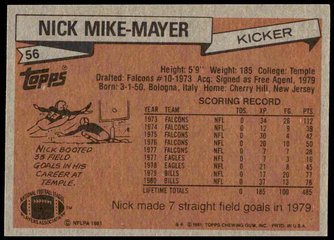 This Football card, from 1981 is part of the Topps  card set. Nick Mike-Mayer is featured and has a card number of 56.