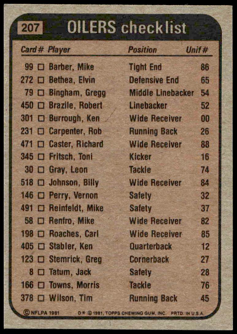 This Football card, from 1981 is part of the Topps  card set. Oilers Checklist is featured and has a card number of 207.