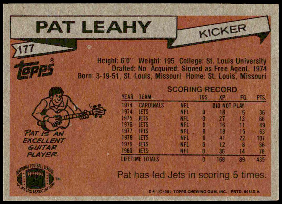 This Football card, from 1981 is part of the Topps  card set. Pat Leahy is featured and has a card number of 177.
