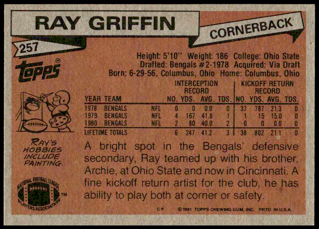 This Football card, from 1981 is part of the Topps  card set. Ray Griffin is featured and has a card number of 257.