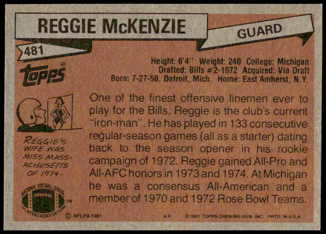 This Football card, from 1981 is part of the Topps  card set. Reggie McKenzie is featured and has a card number of 481.