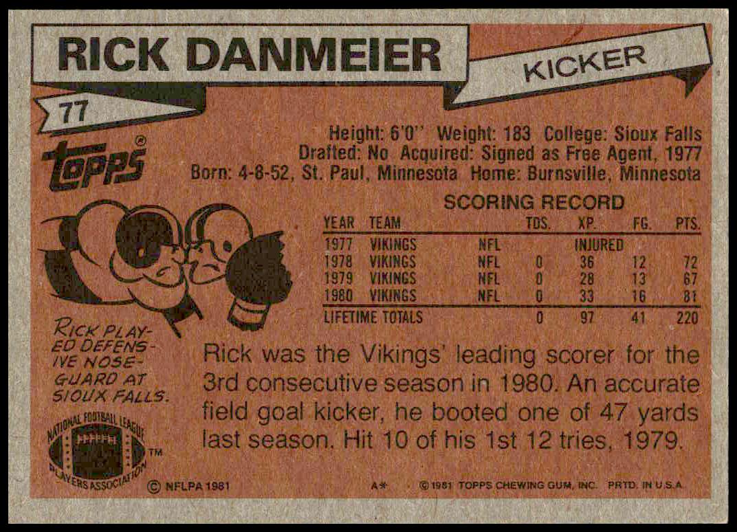 This Football card, from 1981 is part of the Topps  card set. Rick Danmeier is featured and has a card number of 77.