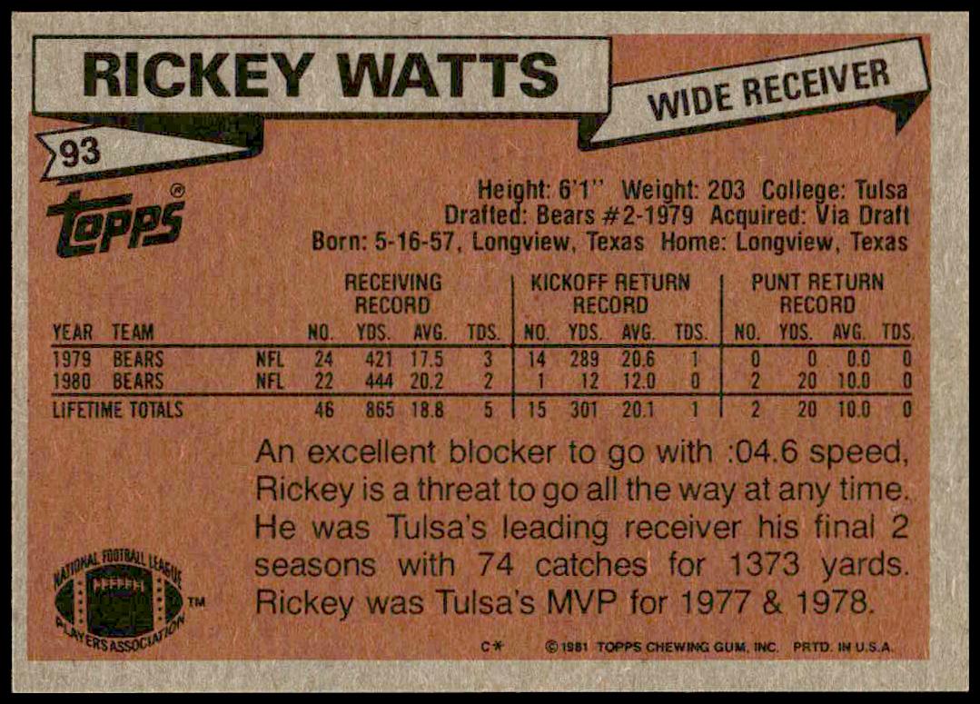 This Football card, from 1981 is part of the Topps  card set. Rickey Watts is featured and has a card number of 93.