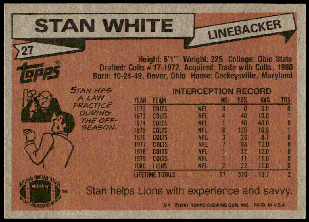 This Football card, from 1981 is part of the Topps  card set. Stan White is featured and has a card number of 27.