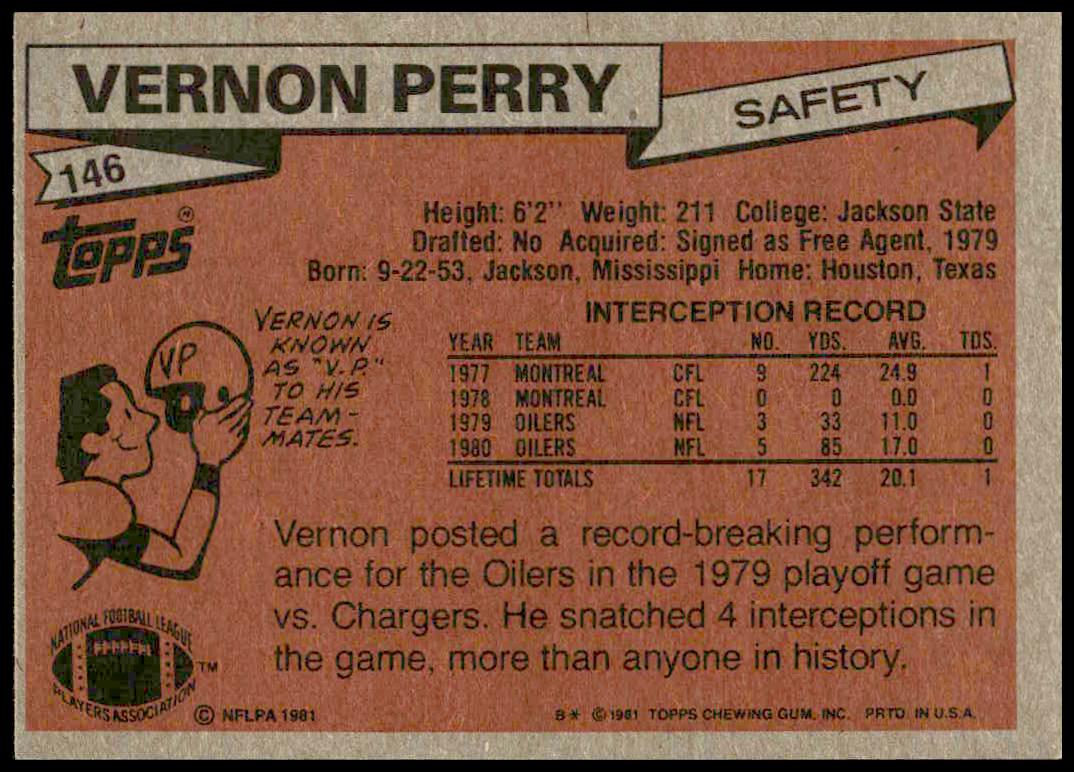 This Football card, from 1981 is part of the Topps  card set. Vernon Perry is featured and has a card number of 146.