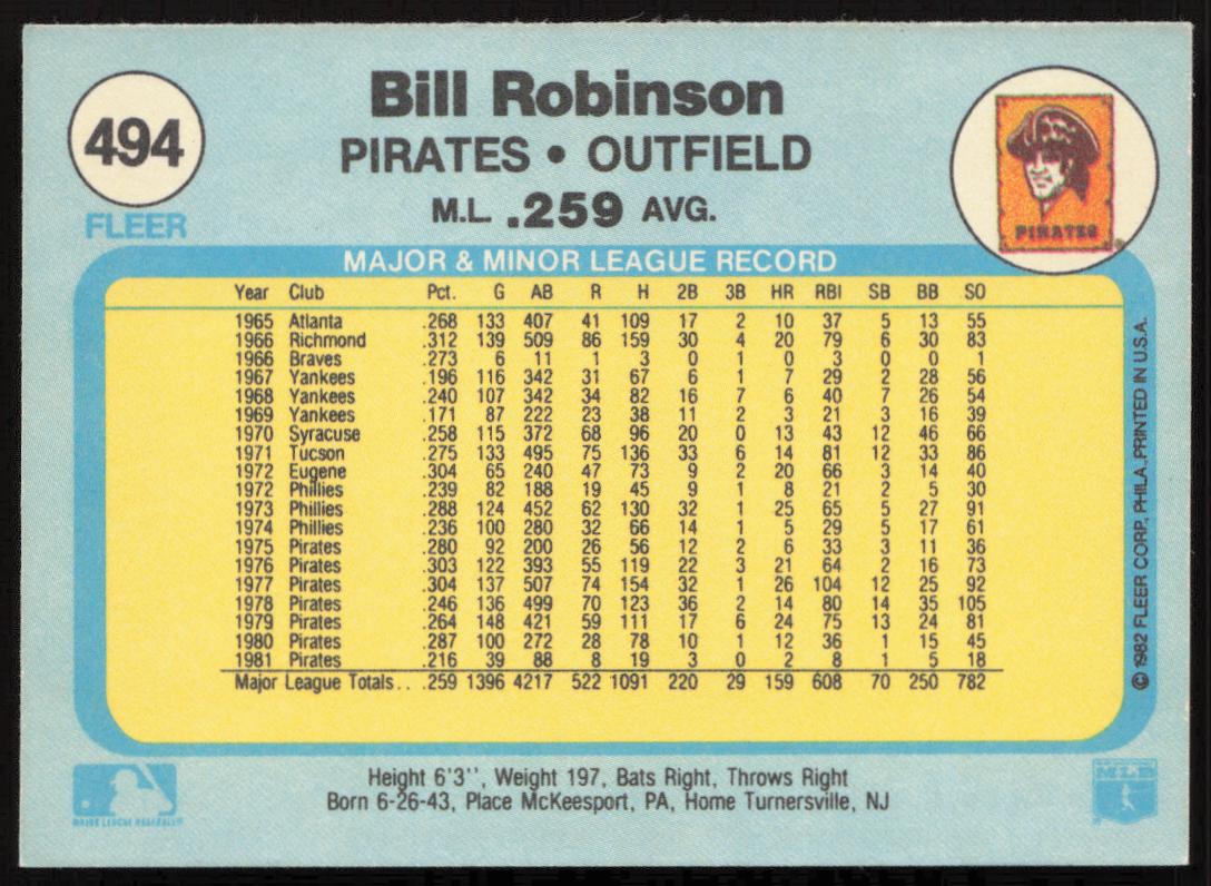 This Baseball card, from 1982 is part of the Fleer  card set. Bill Robinson is featured and has a card number of 494.
