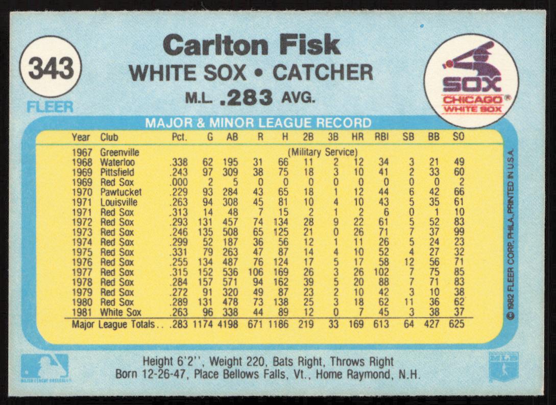 This Baseball card, from 1982 is part of the Fleer  card set. Carlton Fisk is featured and has a card number of 343.