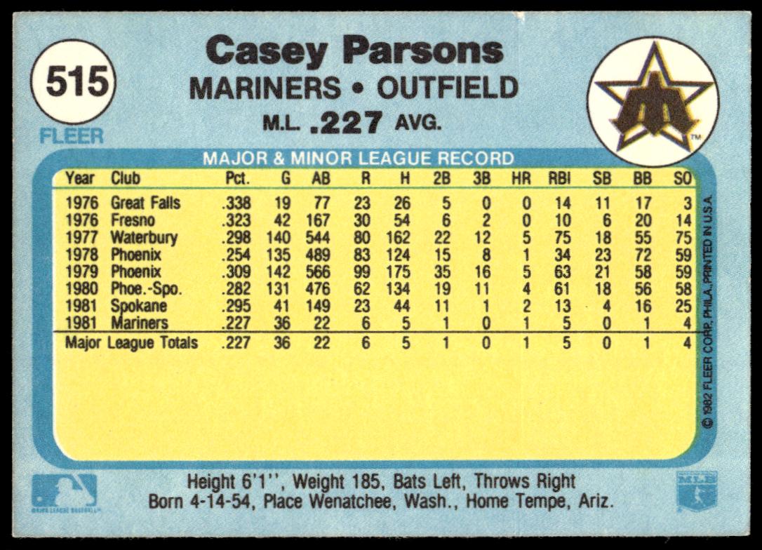 This Baseball card, from 1982 is part of the Fleer  card set. Casey Parsons is featured and has a card number of 515.