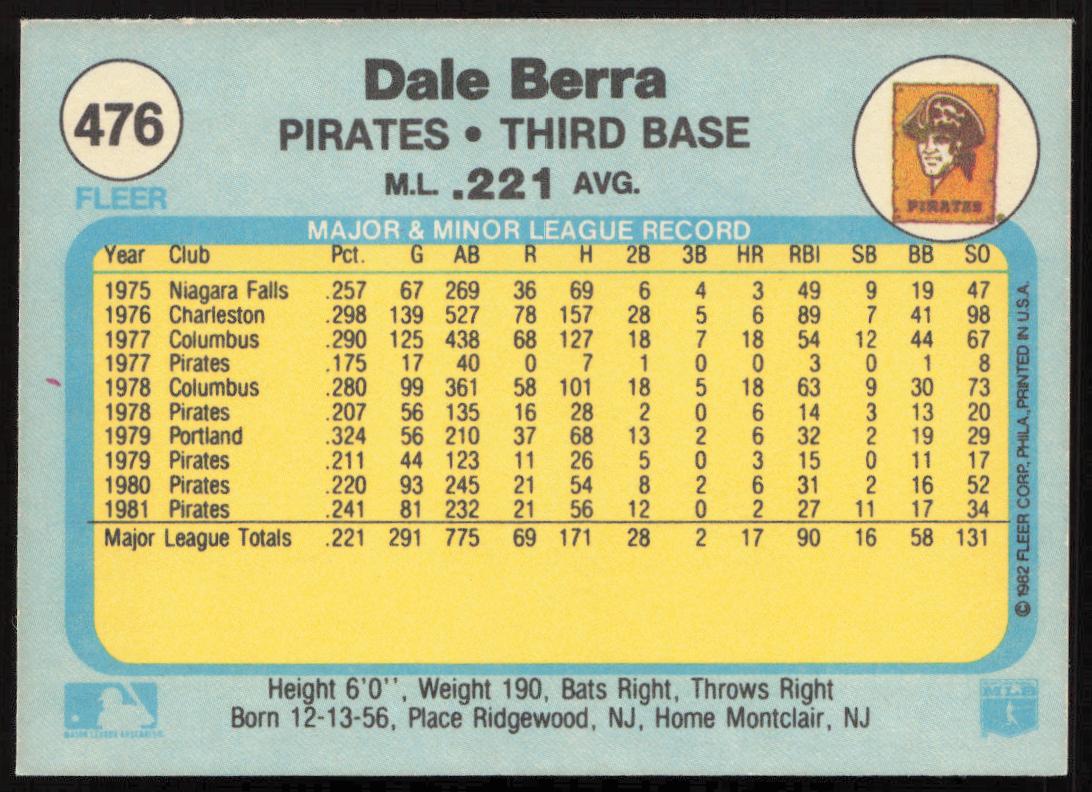 This Baseball card, from 1982 is part of the Fleer  card set. Dale Berra is featured and has a card number of 476.
