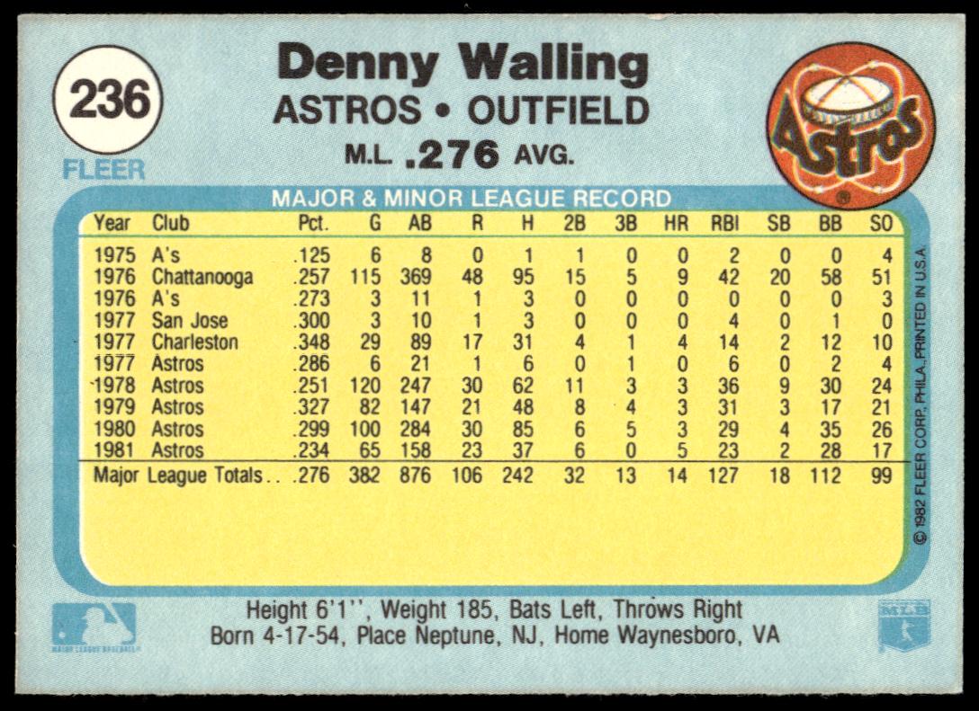 This Baseball card, from 1982 is part of the Fleer  card set. Denny Walling is featured and has a card number of 236.