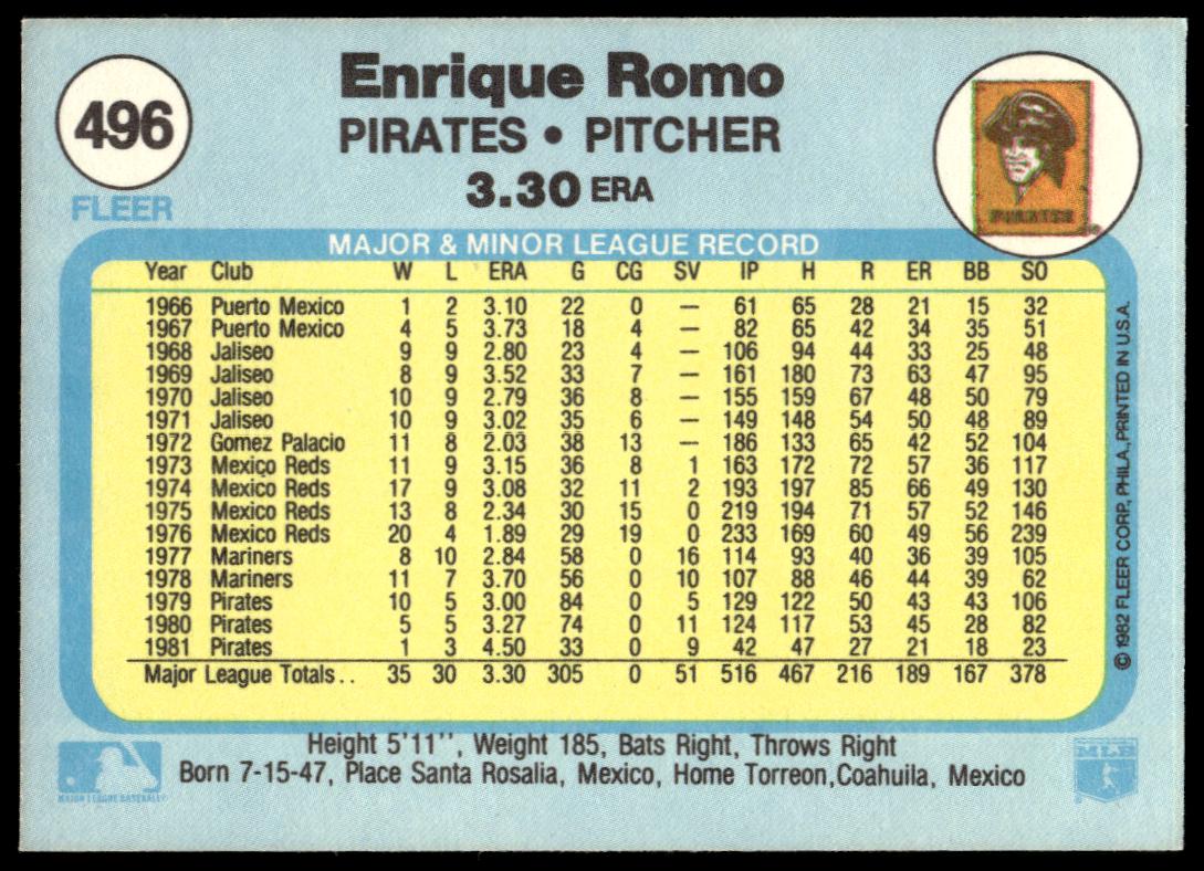 This Baseball card, from 1982 is part of the Fleer  card set. Enrique Romo is featured and has a card number of 496.