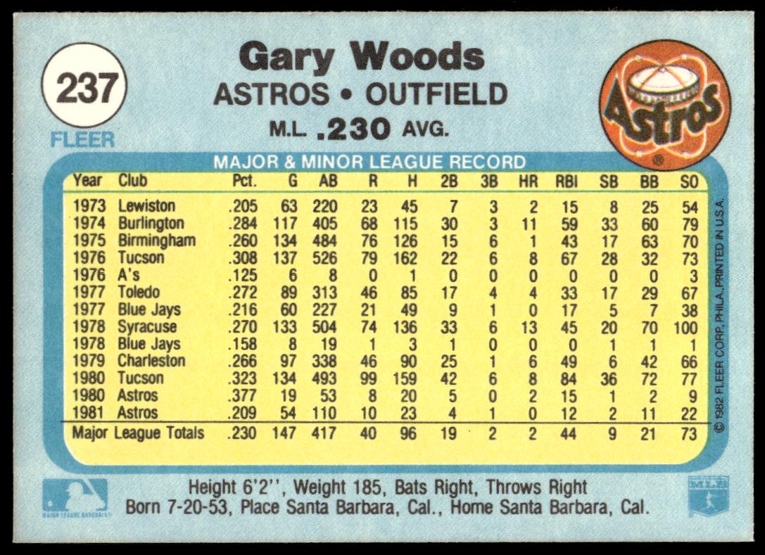 This Baseball card, from 1982 is part of the Fleer  card set. Gary Woods is featured and has a card number of 237.
