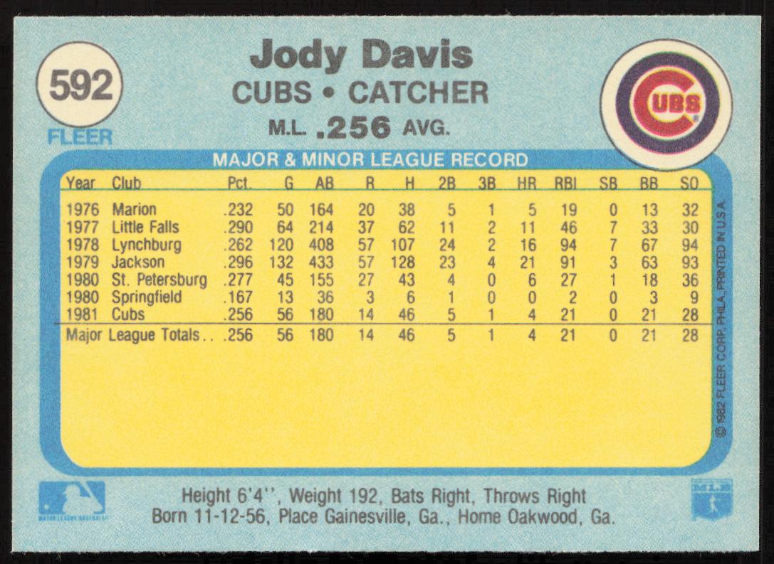 This Baseball card, from 1982 is part of the Fleer  card set. Jody Davis is featured and has a card number of 592.