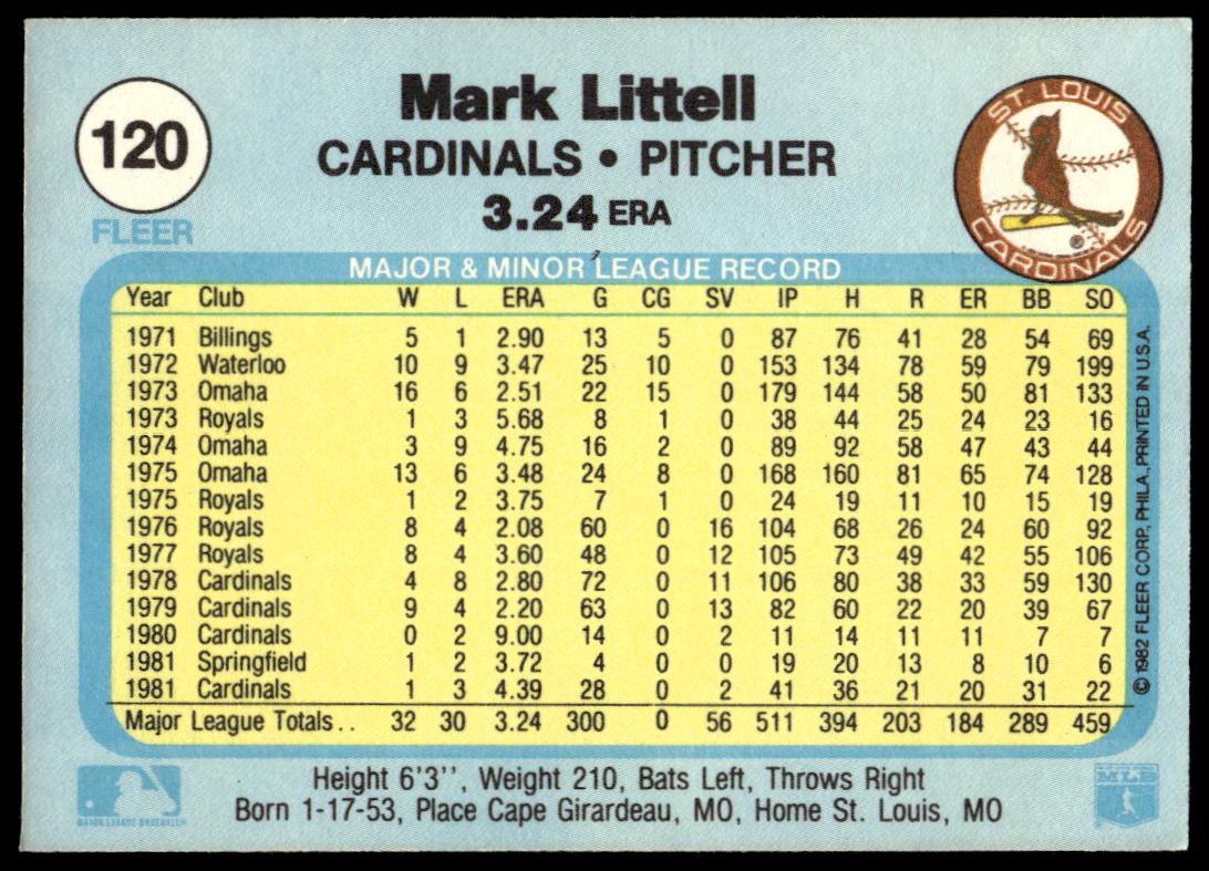 This Baseball card, from 1982 is part of the Fleer  card set. Mark Littell is featured and has a card number of 120.