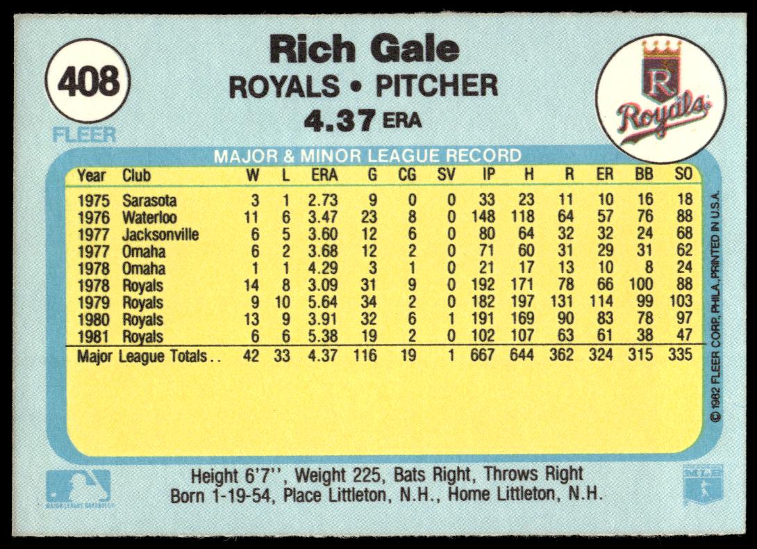 This Baseball card, from 1982 is part of the Fleer  card set. Rich Gale is featured and has a card number of 408.