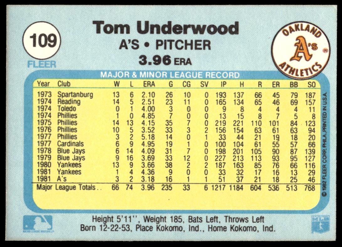 This Baseball card, from 1982 is part of the Fleer  card set. Tom Underwood is featured and has a card number of 109.