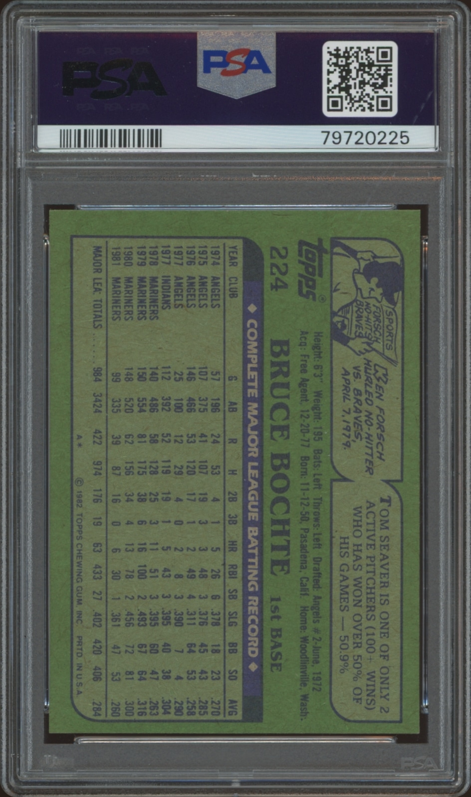 This Baseball card, from 1982 is part of the Topps  card set. Bruce Bochte is featured and has a card number of 224. It is graded by PSA and has a numeric grade of 8.