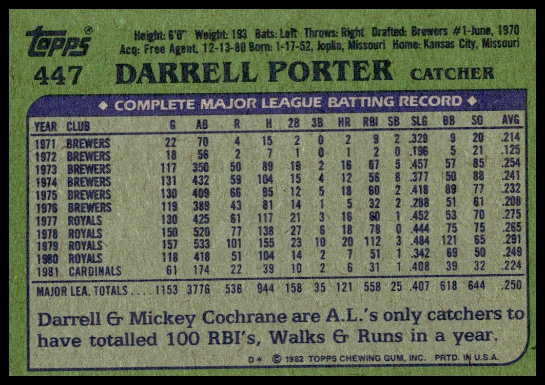 This Baseball card, from 1982 is part of the Topps  card set. Darrell Porter is featured and has a card number of 447.