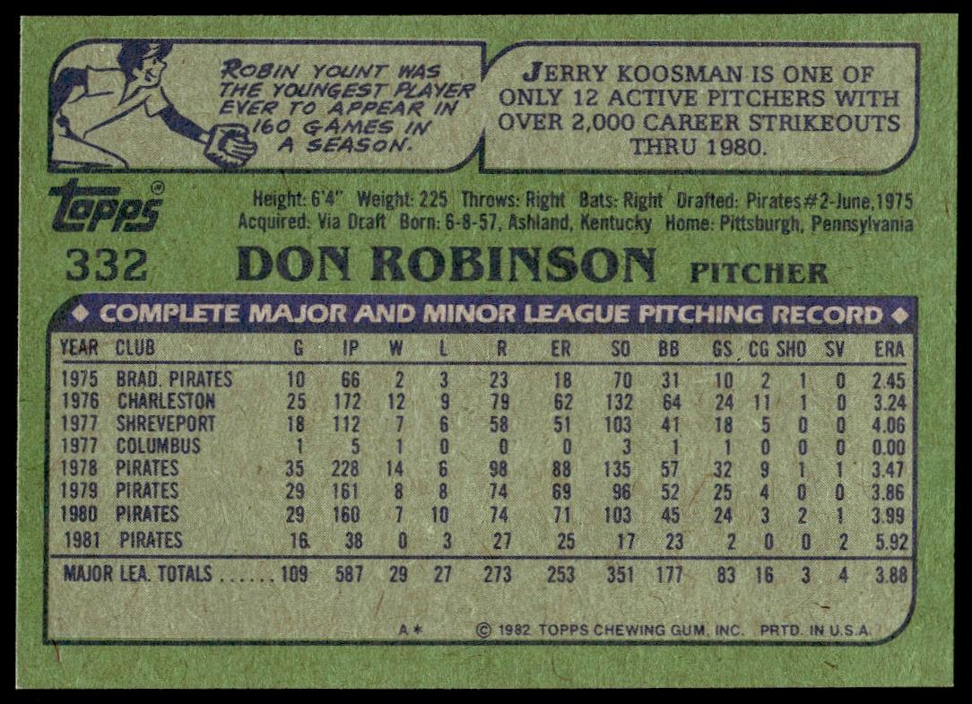 This Baseball card, from 1982 is part of the Topps  card set. Don Robinson is featured and has a card number of 332.