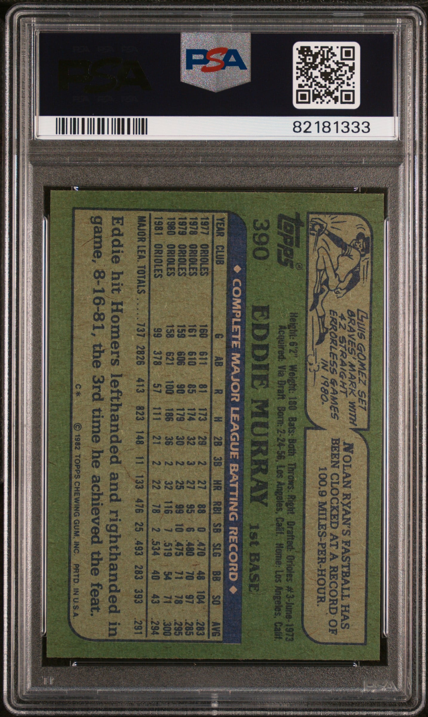 Collect the 1982 Topps Eddie Murray #390 in PSA 7 condition, a must-have for baseball card enthusiasts and a valuable addition to any collection.