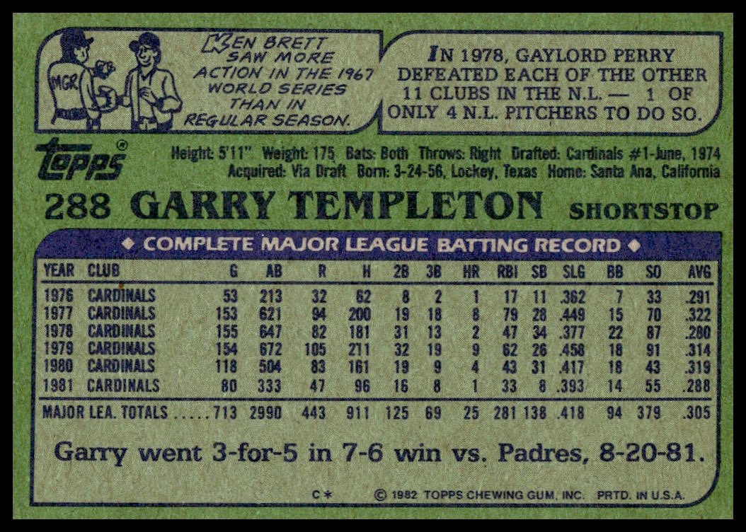 This Baseball card, from 1982 is part of the Topps  card set. Garry Templeton is featured and has a card number of 288.