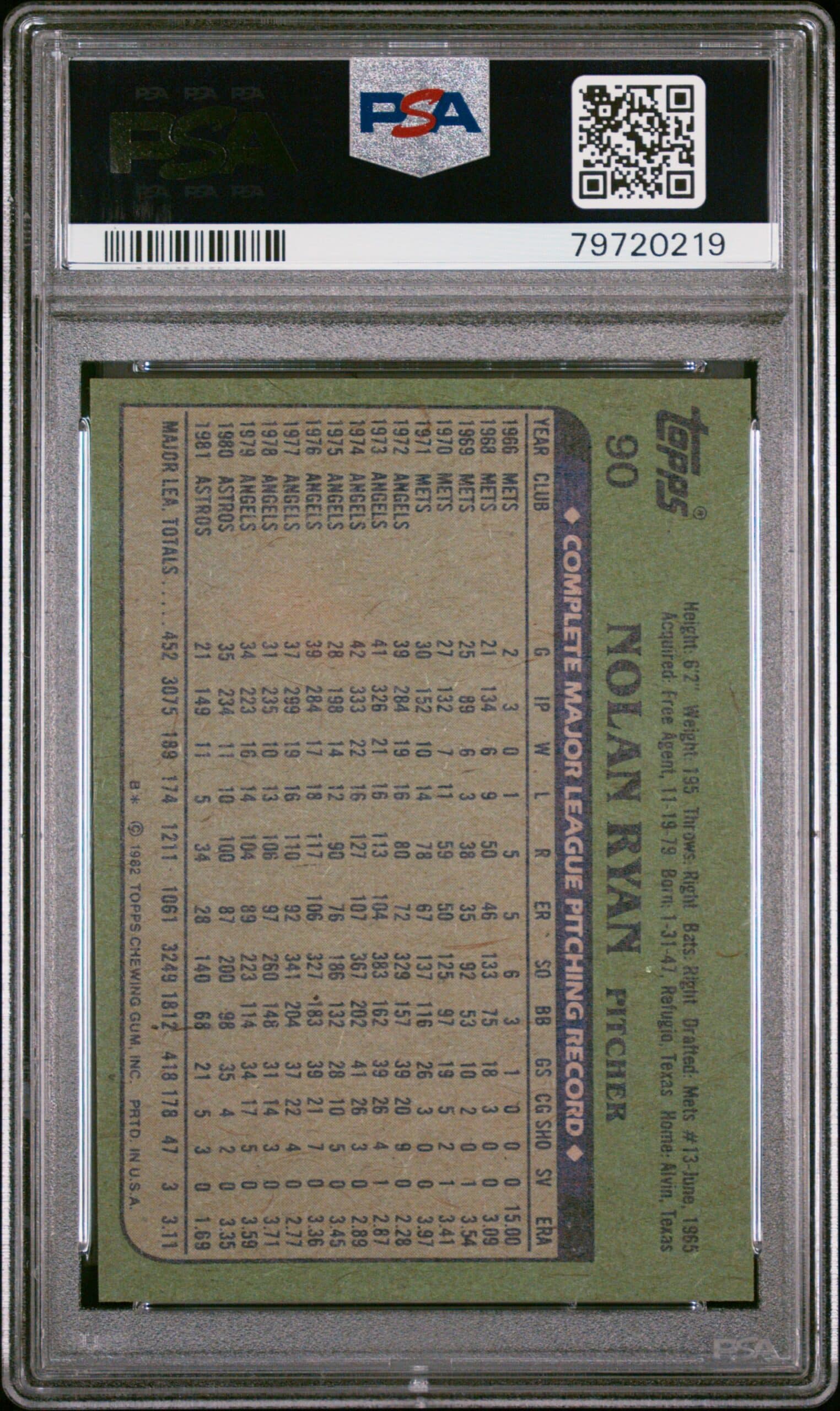 Collect the iconic 1982 Topps Nolan Ryan #90 graded PSA 7, a must-have for baseball card enthusiasts and fans of the legendary pitcher!