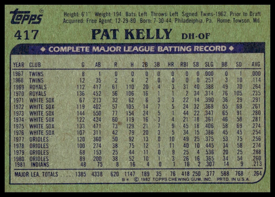 This Baseball card, from 1982 is part of the Topps  card set. Pat Kelly is featured and has a card number of 417.
