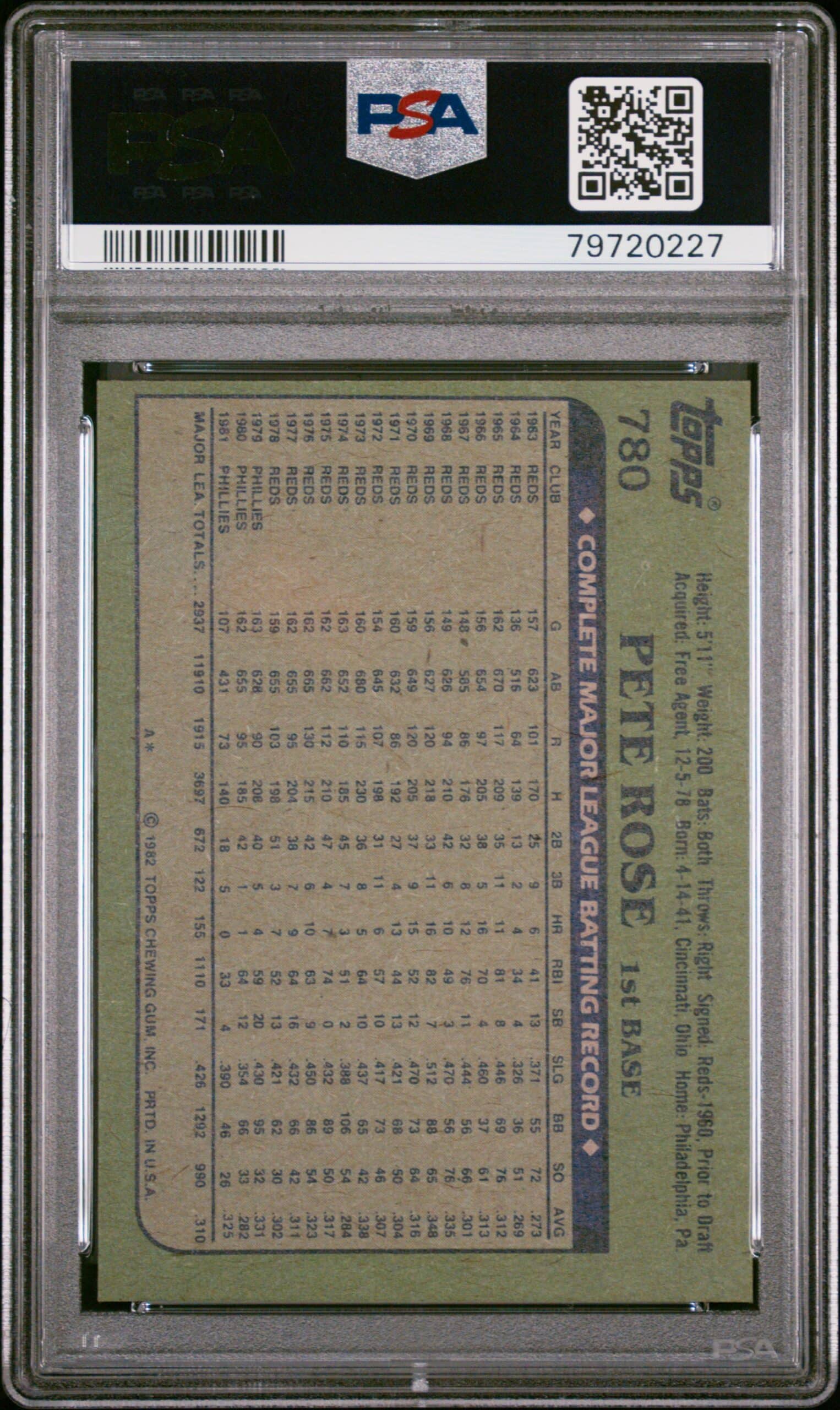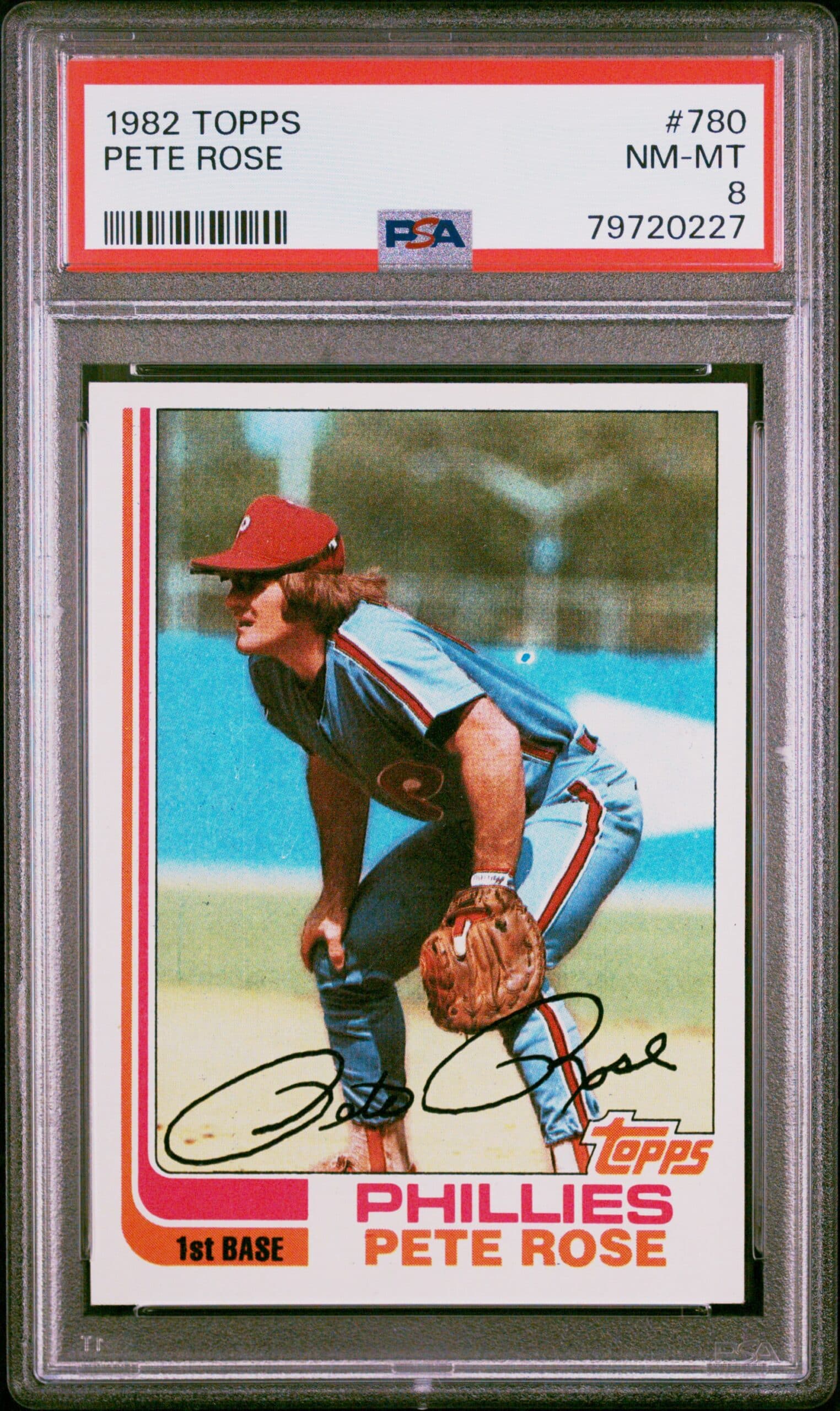 This Baseball card, from 1982 is part of the Topps card set. Pete Rose is featured and has a card number of 780. It is graded by PSA and has a numeric grade of 8.