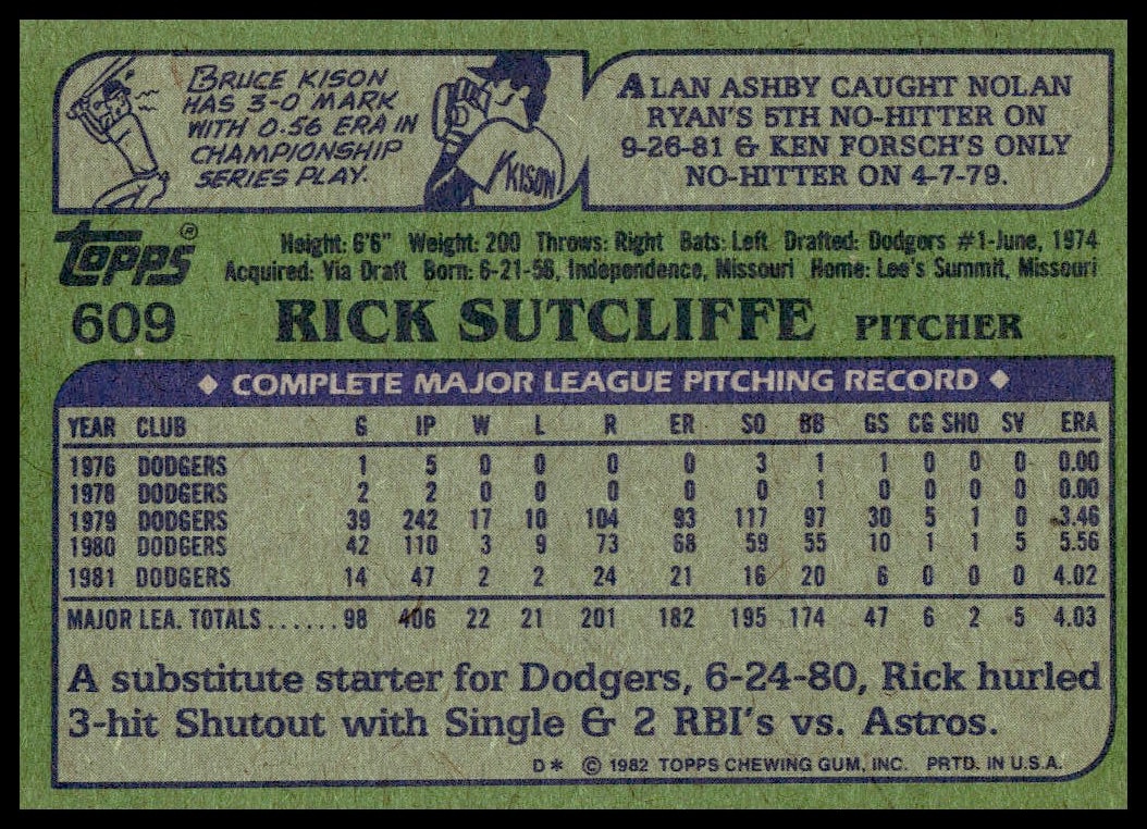 This Baseball card, from 1982 is part of the Topps  card set. Rick Sutcliffe is featured and has a card number of 609.