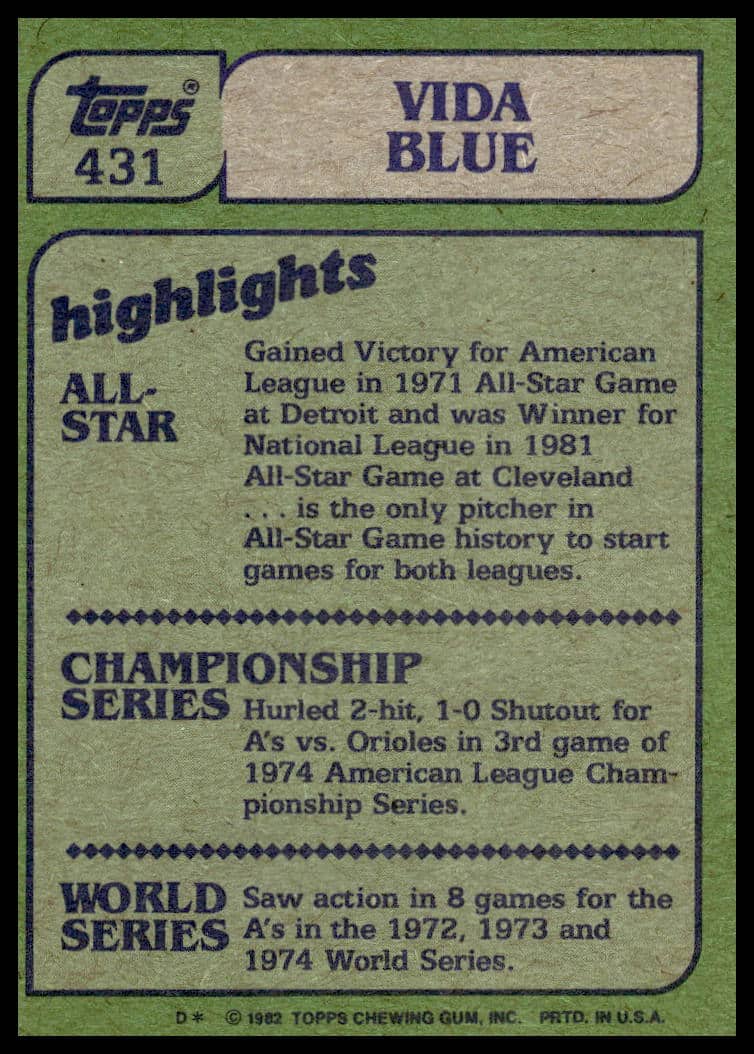 This Baseball card, from 1982 is part of the Topps  card set. Vida Blue is featured and has a card number of 431.