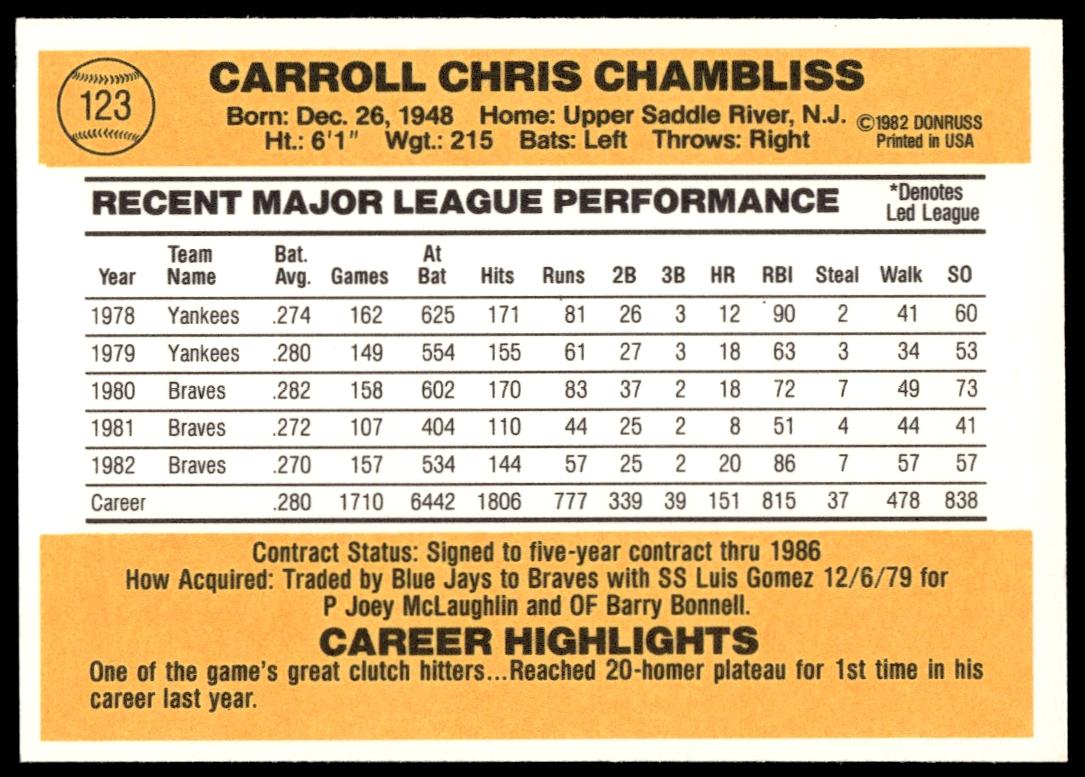 This Baseball card, from 1983 is part of the Donruss  card set. Chris Chambliss is featured and has a card number of 123.