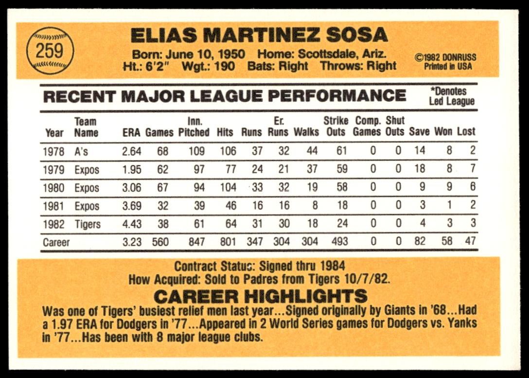 This Baseball card, from 1983 is part of the Donruss  card set. Elias Sosa is featured and has a card number of 259.