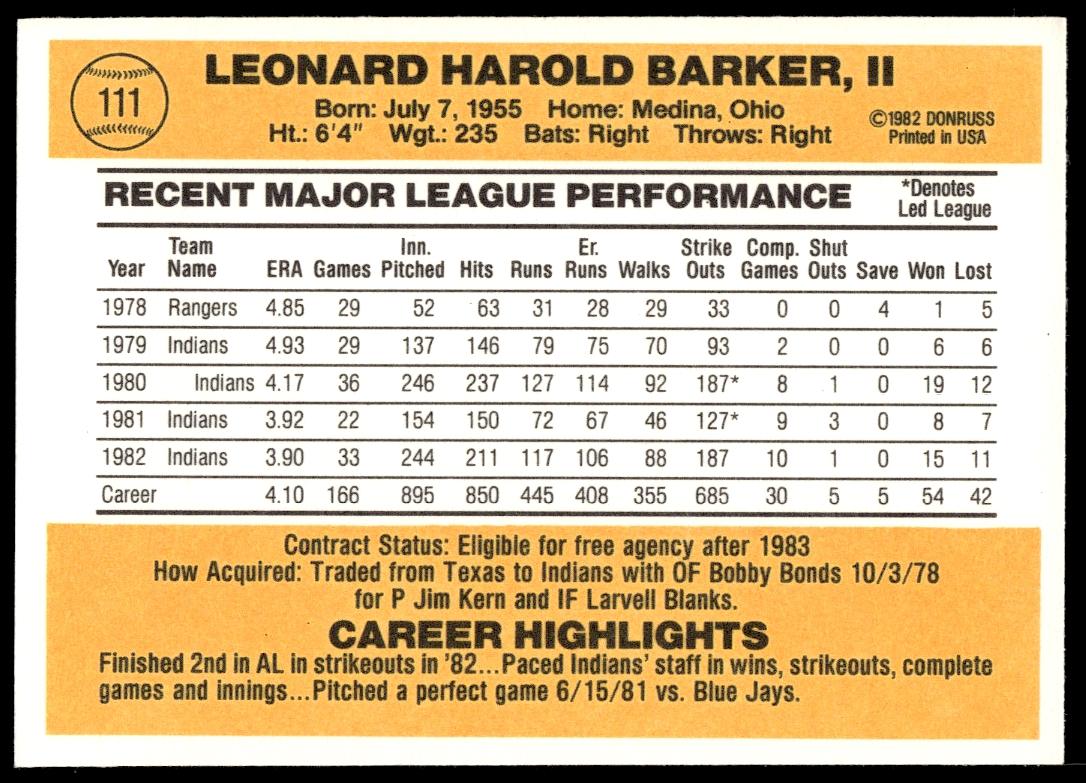 This Baseball card, from 1983 is part of the Donruss  card set. Len Barker is featured and has a card number of 111.