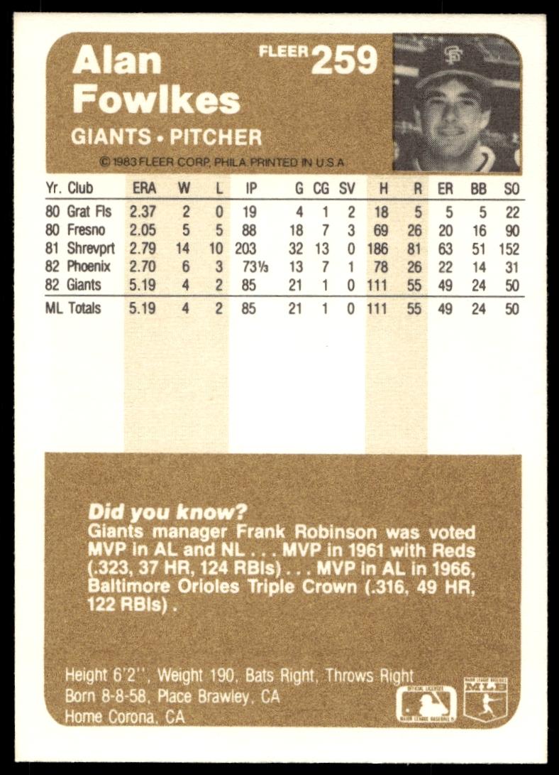 This Baseball card, from 1983 is part of the Fleer  card set. Alan Fowlkes is featured and has a card number of 259.