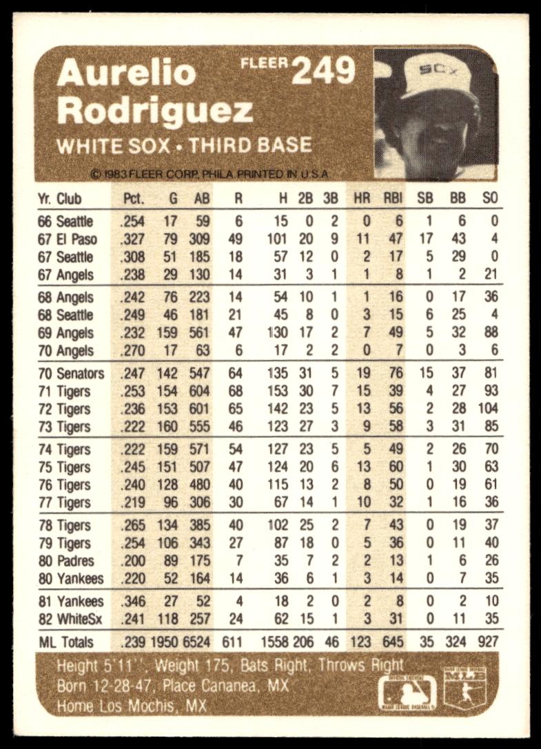 This Baseball card, from 1983 is part of the Fleer  card set. Aurelio Rodriguez is featured and has a card number of 249.